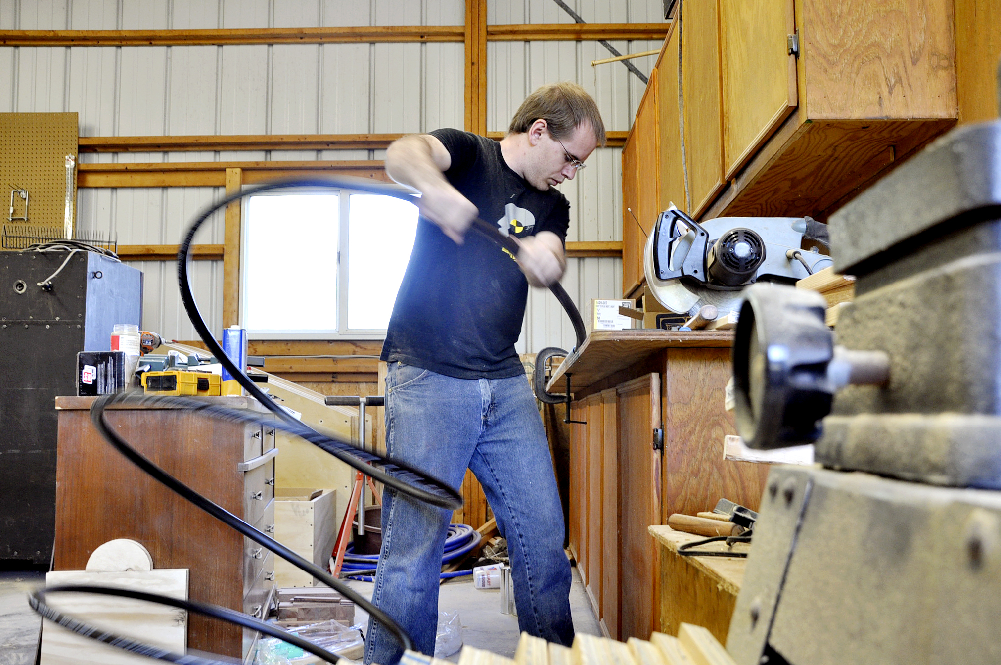 University of Texas senior Kevin Peterson works on quidditch hoops in the garage workshop of his father’s South Austin home. The hoops sell for $300 for a set of six. Photo by Megan Strickland.