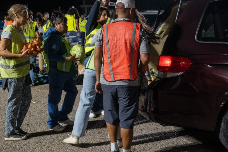 Volunteers load food into cars at the Central Texas Food Bank’s special distribution event Tuesday at Austin’s Nelson Field, a response to people needing help as SNAP benefits are paused. Destiny Lewis/Reporting Texas