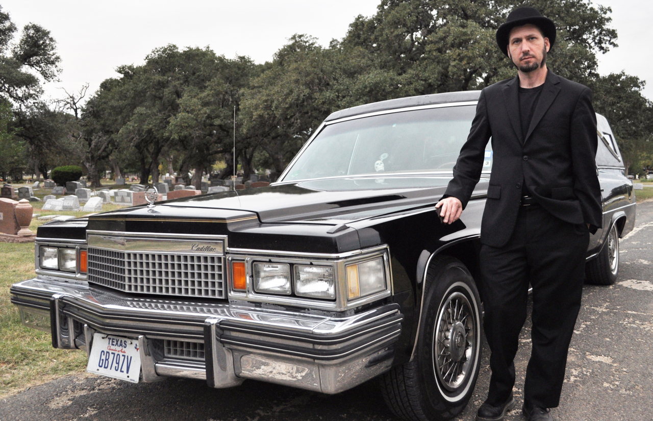 Chris English stands next to the Cadillac hearse he uses for the ghost tours he gives through Haunted ATX. Photo by Gabriel Cristóver Pérez.