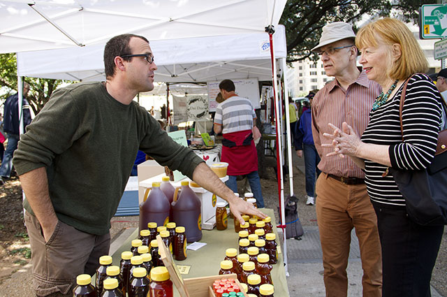 Mark Bradley talks with Marc Trudeau and Cornelia Brandt at Austin’s Downtown Farmers’ Market about the differences in the types of honey he sells. Photo by Oscar Ricardo Silva.