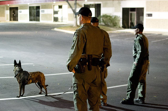 Thursday nights are the only chance the K9 unit gets to spend time together each week. While drills go on in the distance, officers stand around and chat. There had been little real police work for Bowman and Cash this night. Earlier, a suspected carjacker had ditched a stolen vehicle at a dead end and fled on foot. The police officers on site requested the K9 unit’s assistance.