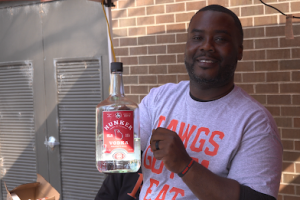 Tamaine Jordan with Hunker Vodka, a spirit created in Georgia, at his tailgate on campus. TJ Krilowicz/Reporting Texas