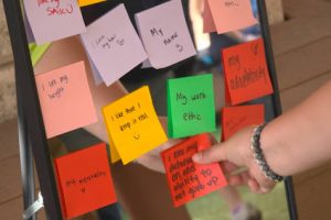 Students add sticky notes to a mirror, asking what their favorite things about themselves are, at Moody Cares. Paisley Porter/Reporting Texas