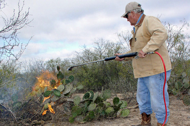Bill Barfield, a South Texas cattle rancher near the Jim Hogg and Starr County line, burns needles off cactus pads to feed to parched cattle. Photo by Omar Montemayor/AgriLife Extension, used with permission.